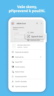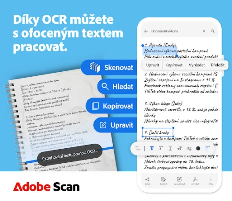 Adobe Scan: skener PDF, OCR zmení váš telefón na výkonný skener dokumentov. Získajte vždy rovné a profesionálne PDF súbory vďaka inteligentnému vyrovnávaniu. Jednoducho digitalizujte, organizujte a prevádzajte obrázky na text pomocou OCR.