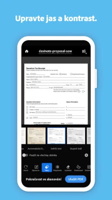 Vylepšite svoje skeny pomocou rozsiahlych editačných nástrojov. Orezávajte, otáčajte, upravujte farby, jas a kontrast, alebo jednoducho odstráňte akékoľvek nedokonalosti pre krištáľovo čistý výsledok. Svoje súbory môžete ľahko usporiadať do prehľadných priečinkov, spájať viacero skenov do jedného dokumentu a dokonca inteligentne vyhľadávať dokumenty vo vašej fotogalérii, ktoré Adobe Scan automaticky premení na PDF. Všetky naskenované dáta sa bezpečne ukladajú do Adobe Document Cloud, čo zaručuje okamžitý prístup a jednoduché zdieľanie naprieč platformami, vrátane bezproblémovej integrácie s Adobe Acrobat Reader pre ďalšie možnosti úprav, komentovania či podpisovania.