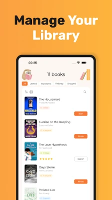 Ponorte sa do sveta sledovania čitateľského pokroku s LibRoom. Zaznamenajte si začiatky a konce každého čítania, vrátane opätovného prečítania obľúbených diel, ktoré získajú svoju vlastnú históriu. Náš intuitívny kalendár vám vizuálne ukáže, ktoré knihy máte aktuálne rozčítané alebo ktoré ste dokončili v daný deň, čím vás mikro-motivuje k ďalšiemu otáčaniu strán. Ohodnoťte prečítané tituly a zanechajte detailné recenzie, aby ste si uchovali živú spomienku na svoje čitateľské zážitky. Navyše, LibRoom vás pozýva k ročnej čitateľskej výzve. Stanovte si vlastný cieľ, napríklad "Prečítať 25 kníh v roku 2025", a sledujte svoj pokrok v reálnom čase s automaticky aktualizovanými ukazovateľmi.