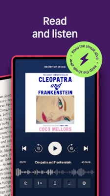 V Nextory sme pre vás pripravili intuitívnu čítačku e-kníh a prepracovaný prehrávač audiokníh, ktoré sú navrhnuté pre váš maximálny komfort. Pri čítaní si jednoducho prispôsobíte veľkosť písma, jas obrazovky a farbu pozadia, zatiaľ čo dvojstranové zobrazenie na tablete verne simuluje pocit z fyzickej knihy. Záložky a inteligentné markery zaistia, že sa vždy vrátite presne tam, kde ste skončili. Pre milovníkov audiokníh je k dispozícii možnosť nastavenia rýchlosti prehrávania, jednoduché pretáčanie a užitočný časovač vypnutia, ktorý sa postará o pokojný spánok. S Nextory už nepotrebujete nosiť ťažké zväzky – stačí jedno zariadenie a neobmedzený svet príbehov je váš.